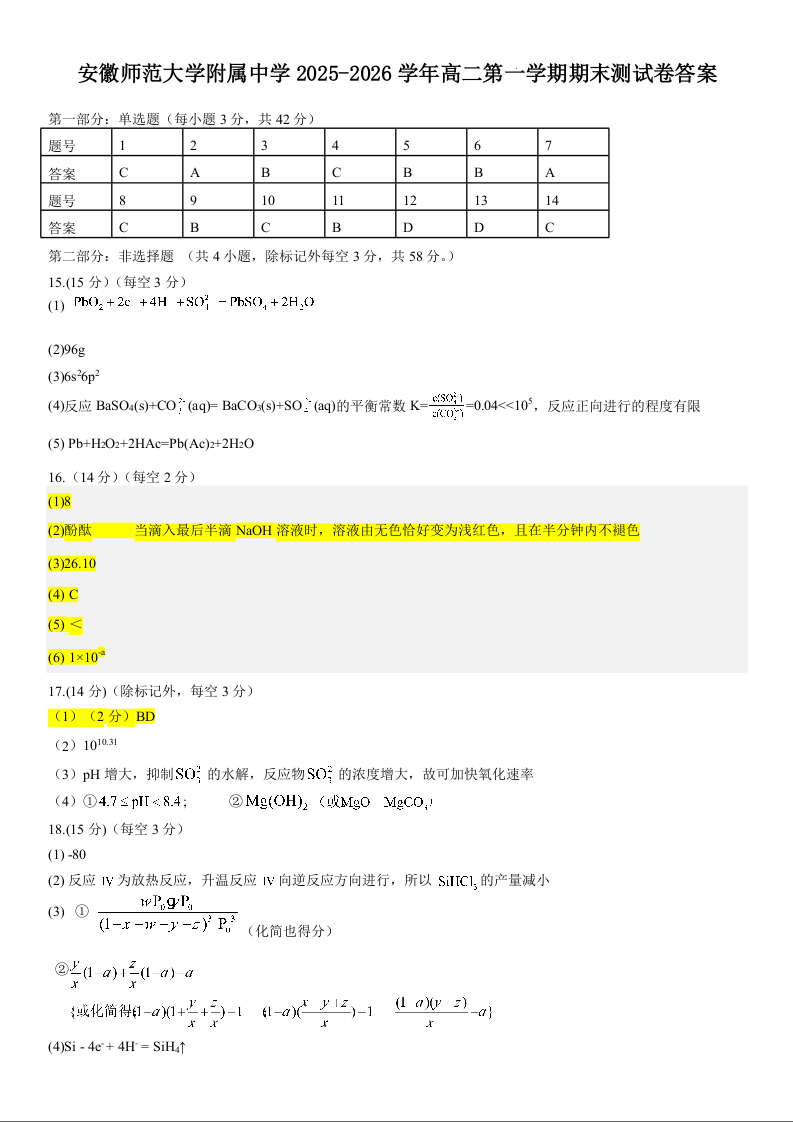 高二化学答案--安徽省芜湖市师大附中2025-2026学年高二上学期期末考试