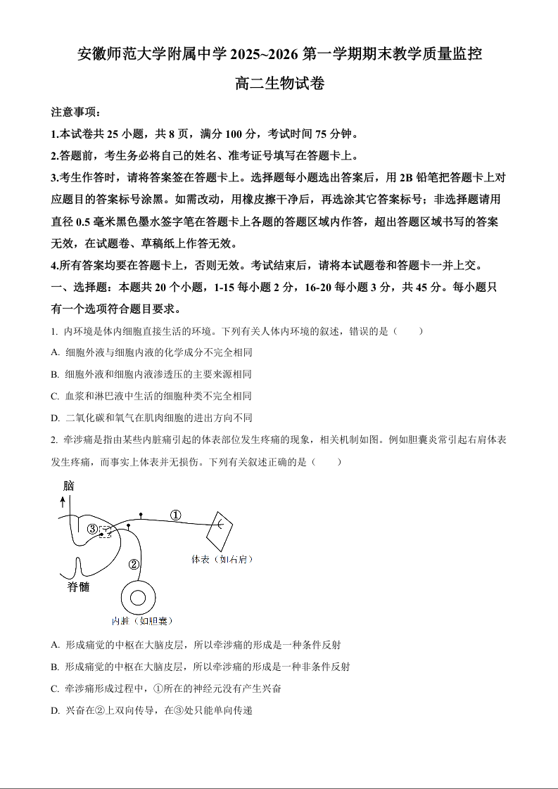 高二生物(原卷版)--安徽省芜湖市师大附中2025-2026学年高二上学期期末考试