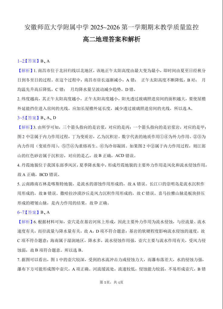 高二地理答案--安徽省芜湖市师大附中2025-2026学年高二上学期期末考试
