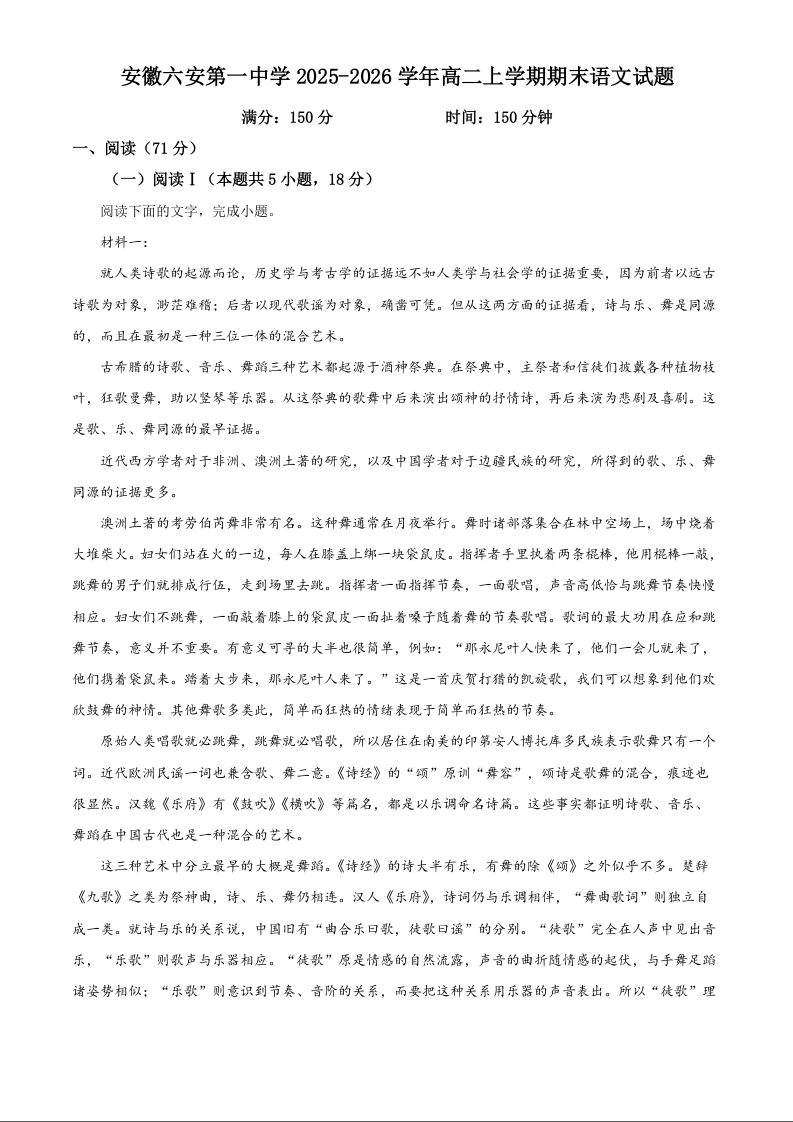 高二语文(原卷版)--安徽省六安市一中2025-2026学年高二上学期期末考试