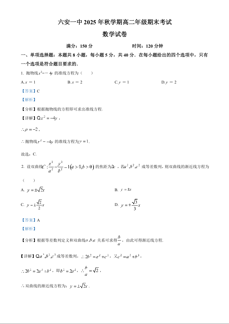 高二数学(解析版)--安徽省六安市一中2025-2026学年高二上学期期末考试