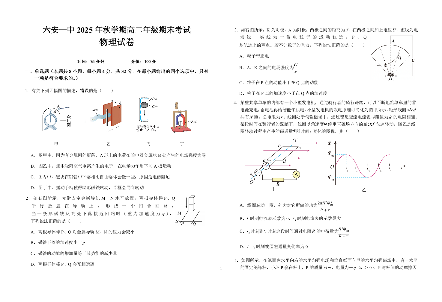 高二物理+答案--安徽省六安市一中2025-2026学年高二上学期期末考试
