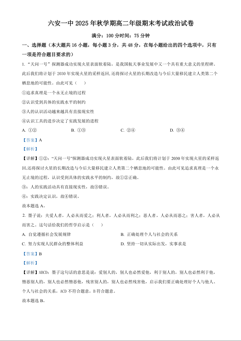 高二政治(解析版)--安徽省六安市一中2025-2026学年高二上学期期末考试