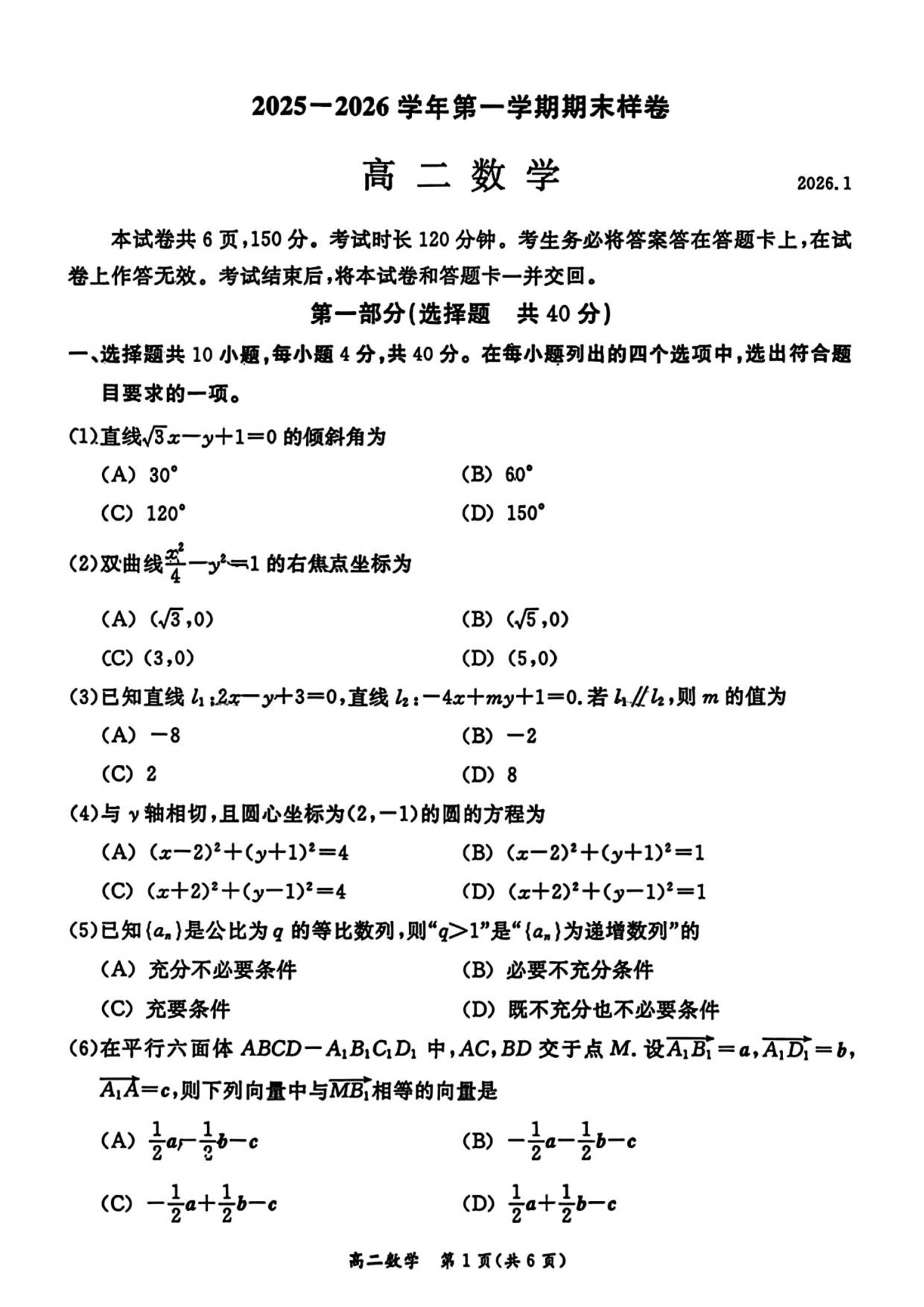 高二数学+答案--北京市东城区2025-2026学年高二上学期期末考试