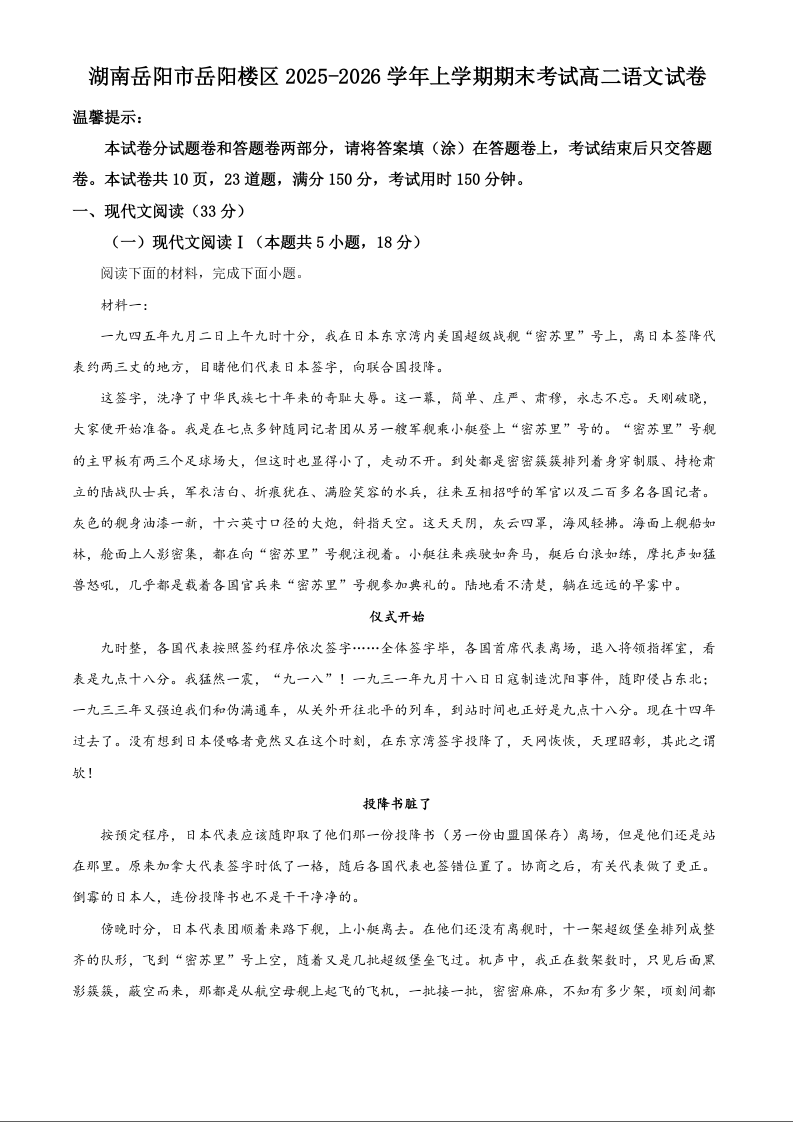 高二语文(解析版)--湖南岳阳市岳阳楼区2025-2026学年高二上学期期末考试