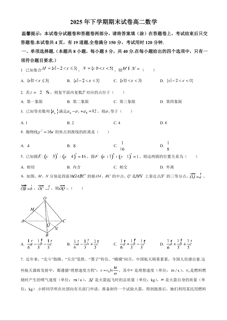 高二数学(原卷版)--湖南岳阳市岳阳楼区2025-2026学年高二上学期期末考试