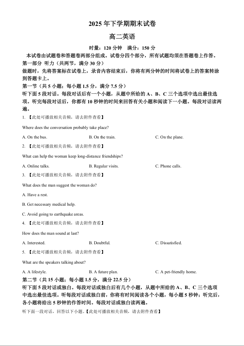 高二英语(原卷版)--湖南岳阳市岳阳楼区2025-2026学年高二上学期期末考试
