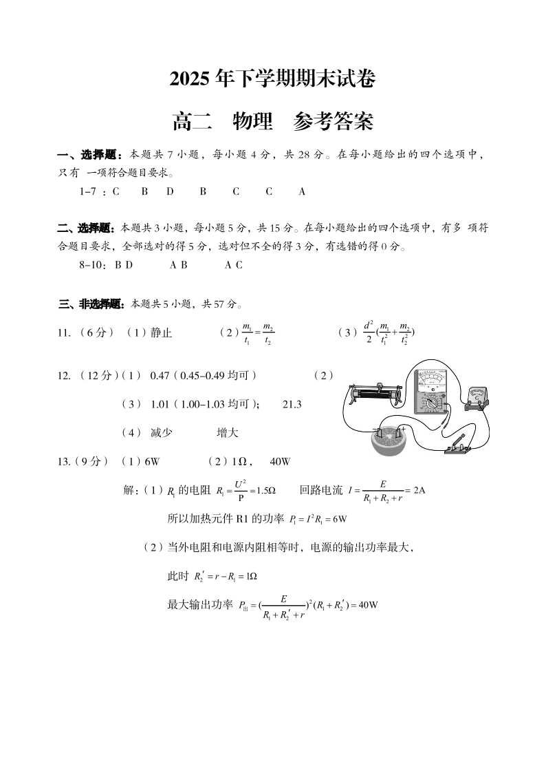 高二物理答案--湖南岳阳市岳阳楼区2025-2026学年高二上学期期末考试