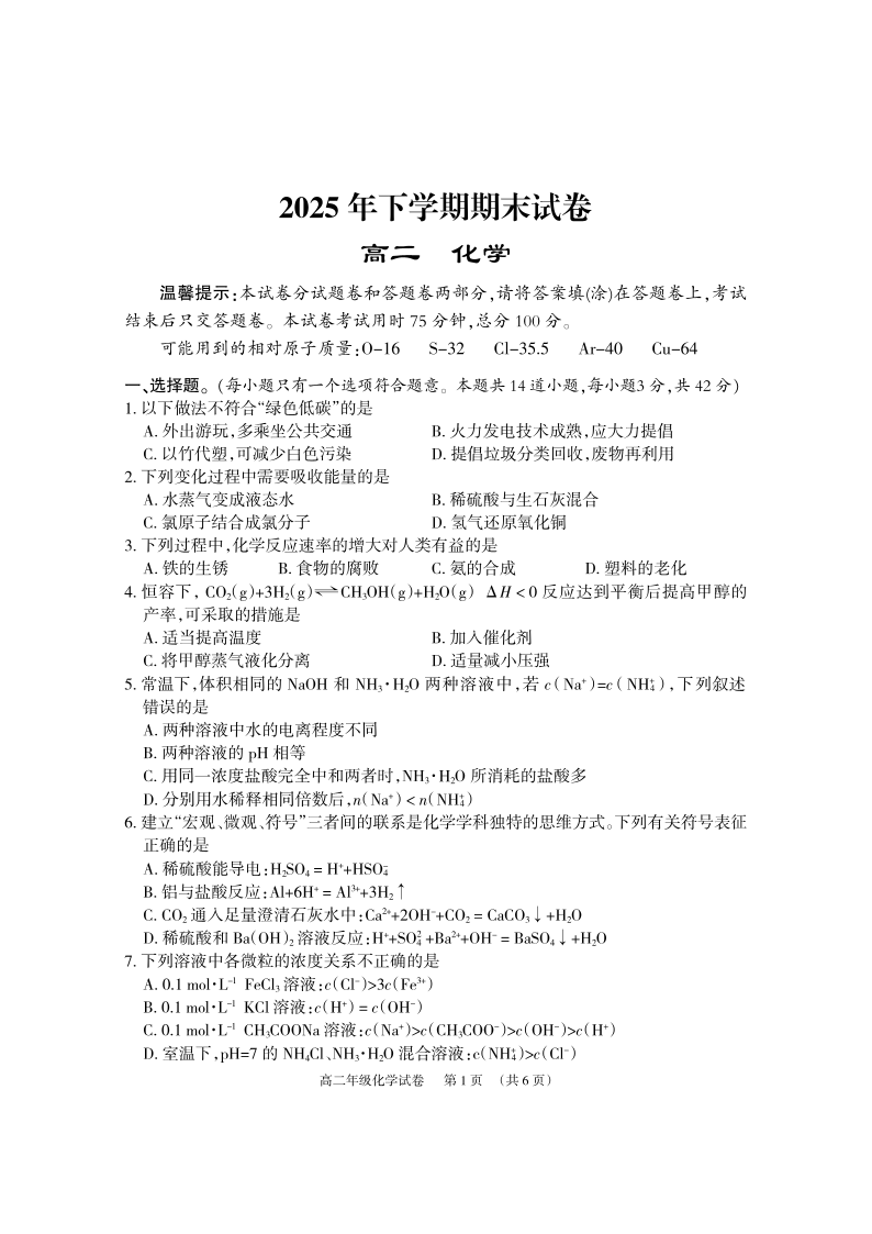 高二化学--湖南岳阳市岳阳楼区2025-2026学年高二上学期期末考试