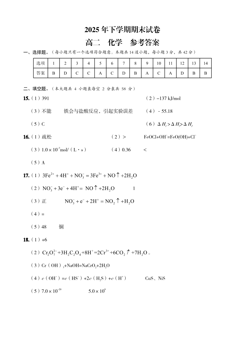 高二化学答案--湖南岳阳市岳阳楼区2025-2026学年高二上学期期末考试