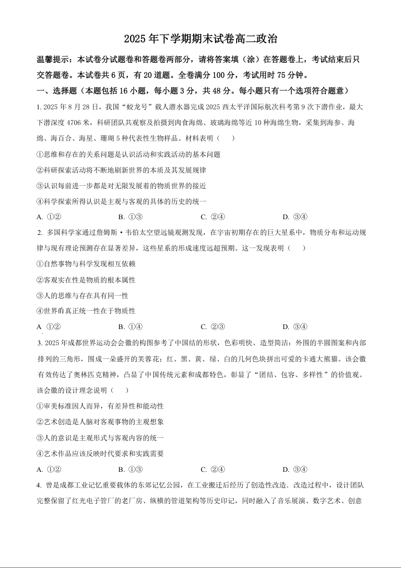 高二政治(原卷版)--湖南岳阳市岳阳楼区2025-2026学年高二上学期期末考试
