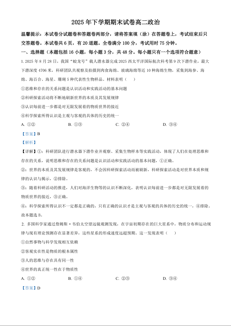 高二政治(解析版)--湖南岳阳市岳阳楼区2025-2026学年高二上学期期末考试