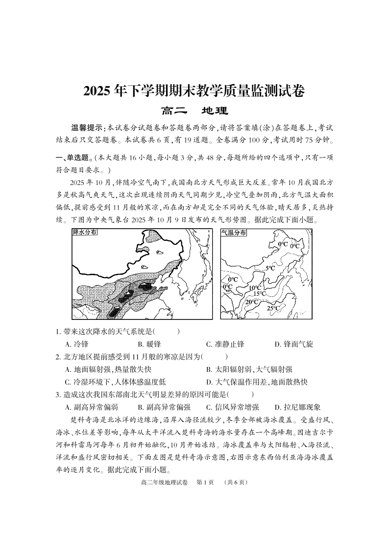 高二地理--湖南岳阳市岳阳楼区2025-2026学年高二上学期期末考试