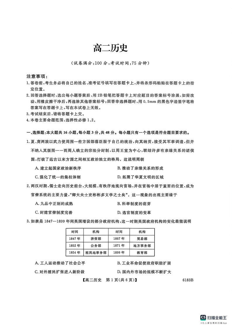 高二历史--吉林省吉林市外五县各高中2025-2026学年高二上学期1月期末考试