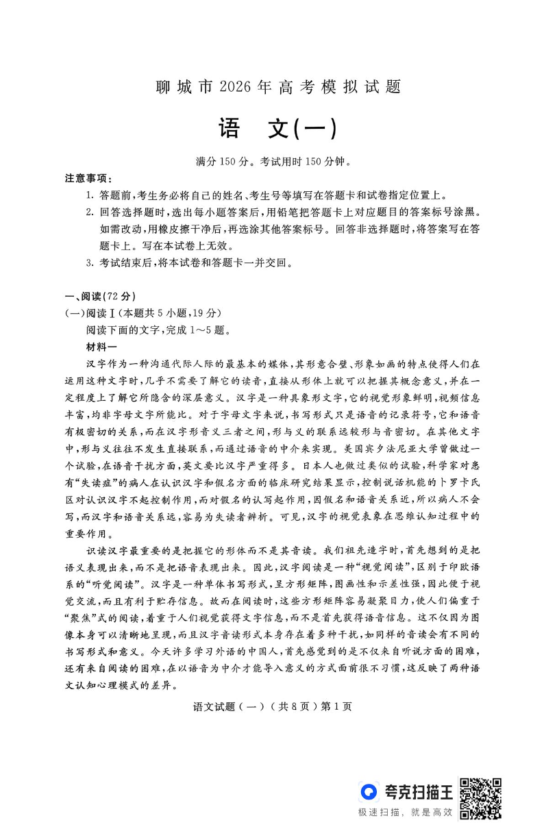 高三语文--山东省聊城市2026届高三下学期3月一模考试(聊城一模)