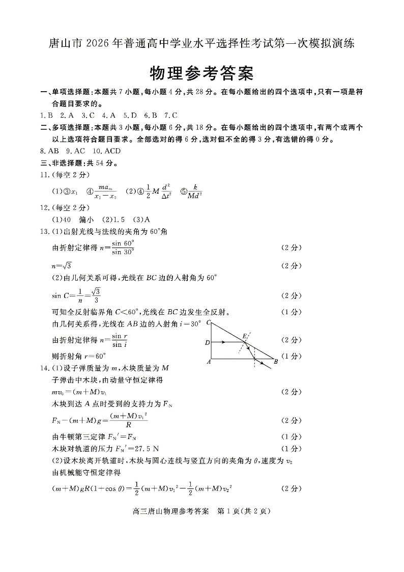 高三物理答案--河北省唐山市2026届高三下学期3月第一次模拟演练
