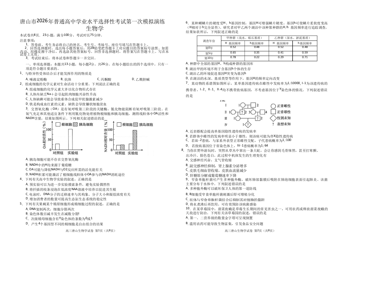 高三生物--河北省唐山市2026届高三下学期3月第一次模拟演练