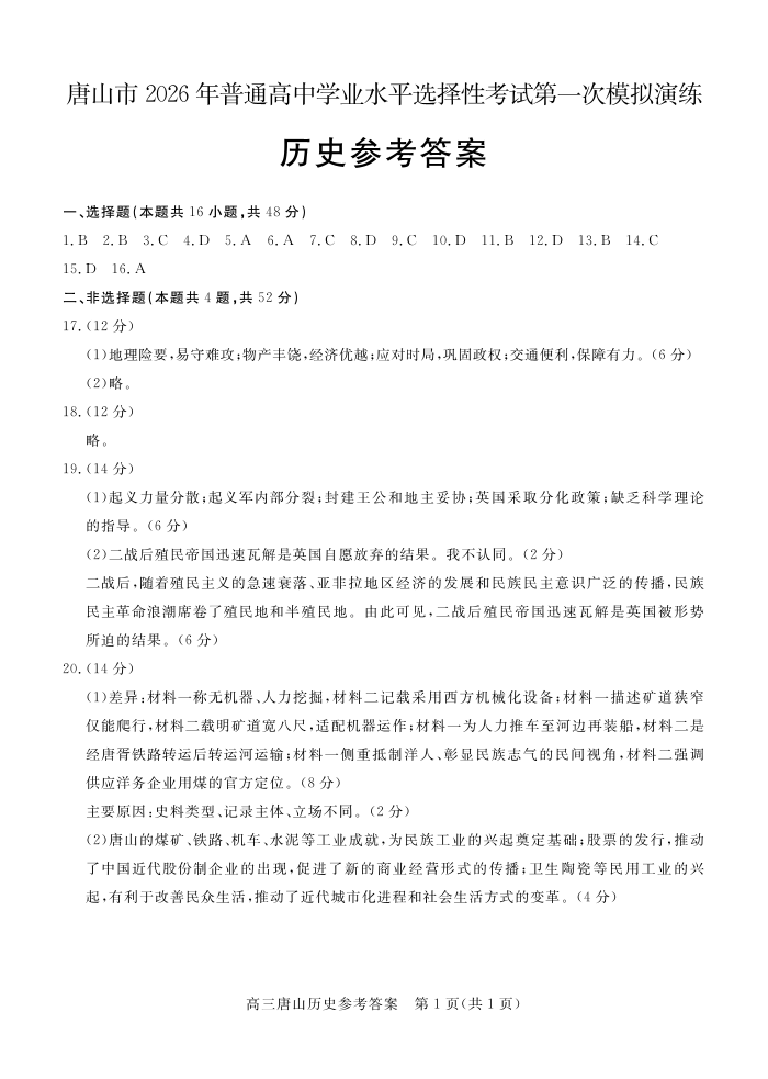 高三历史答案--河北省唐山市2026届高三下学期3月第一次模拟演练