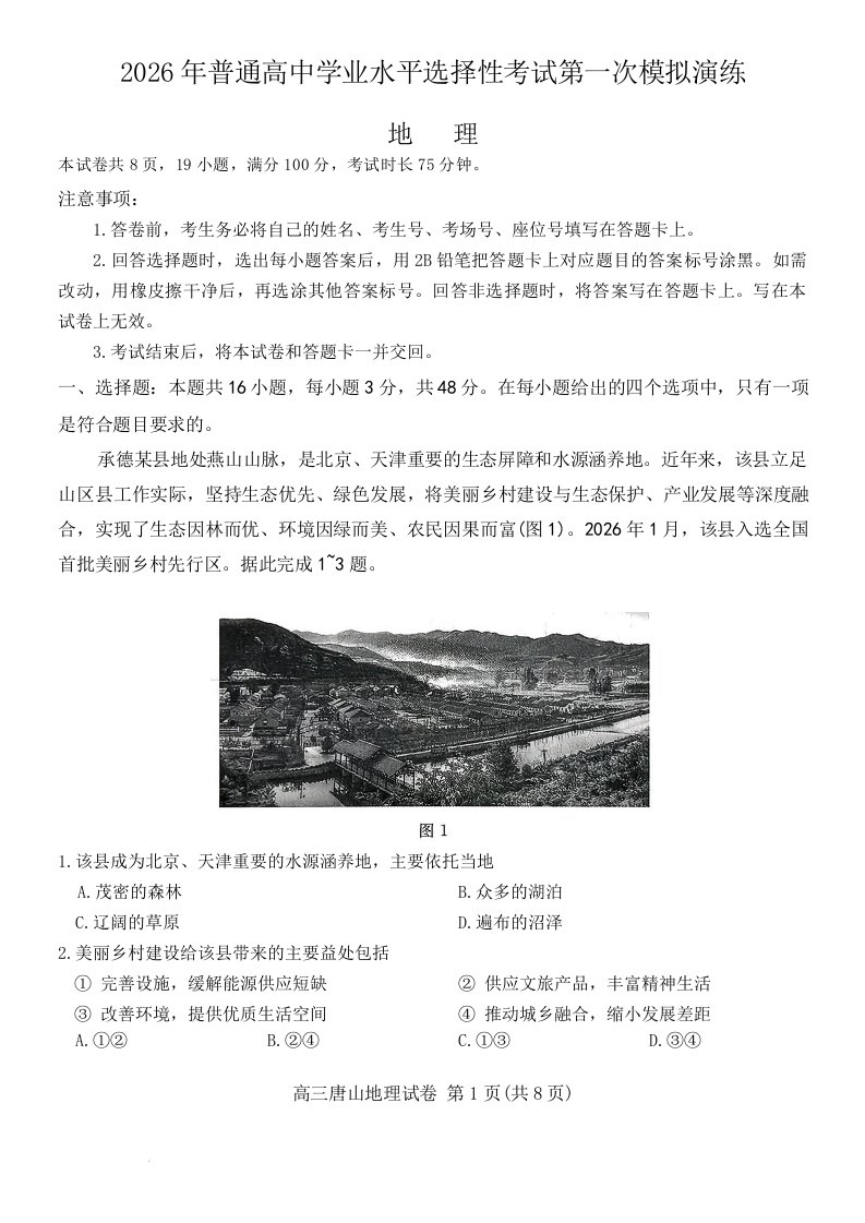 高三地理--河北省唐山市2026届高三下学期3月第一次模拟演练