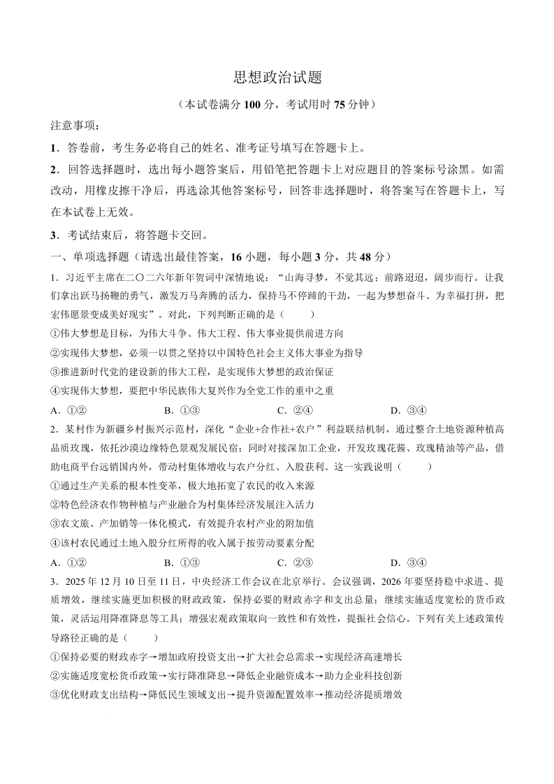 高三政治--陕西省镇安中学2026届高三下学期二模考试