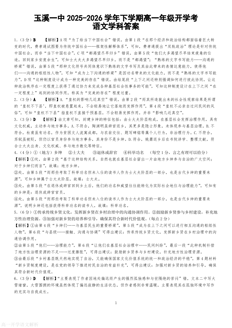 高一语文答案--云南省玉溪市一中2025-2026学年高一下学期开学考试