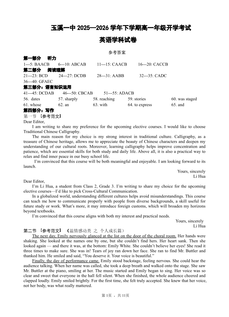 高一英语答案--云南省玉溪市一中2025-2026学年高一下学期开学考试