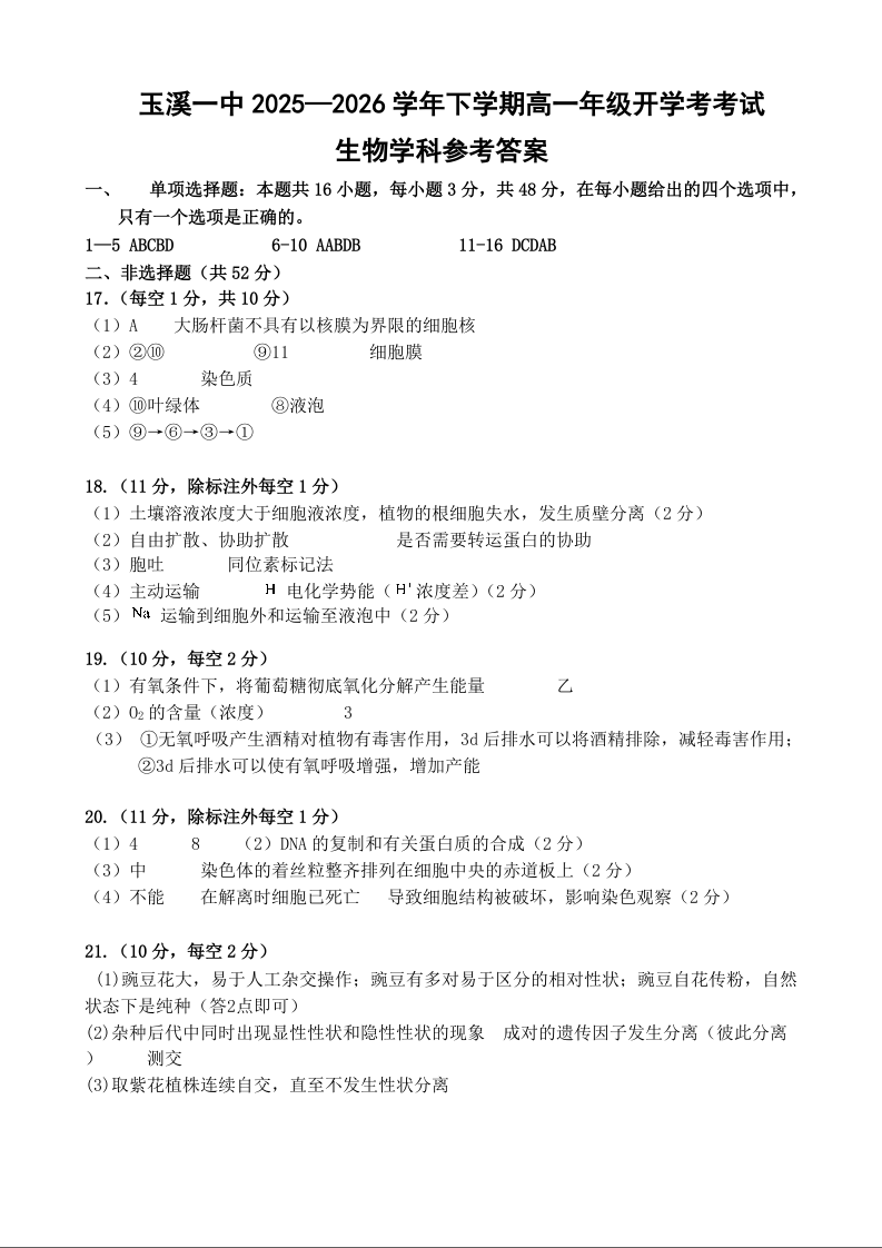 高一生物答案--云南省玉溪市一中2025-2026学年高一下学期开学考试