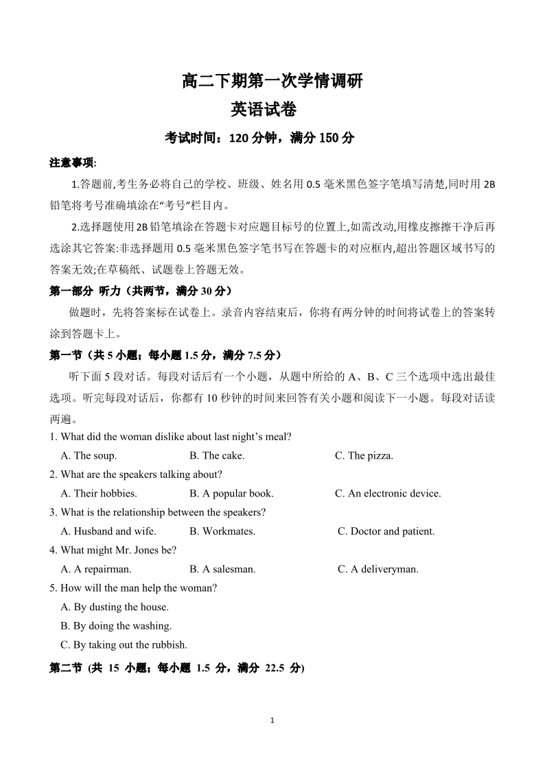 高二英语--四川省南充市嘉陵一中2025-2026学年高二下学期入学考试
