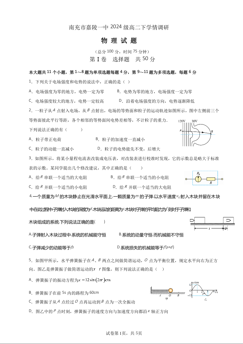 高二物理+答案--四川省南充市嘉陵一中2025-2026学年高二下学期入学考试