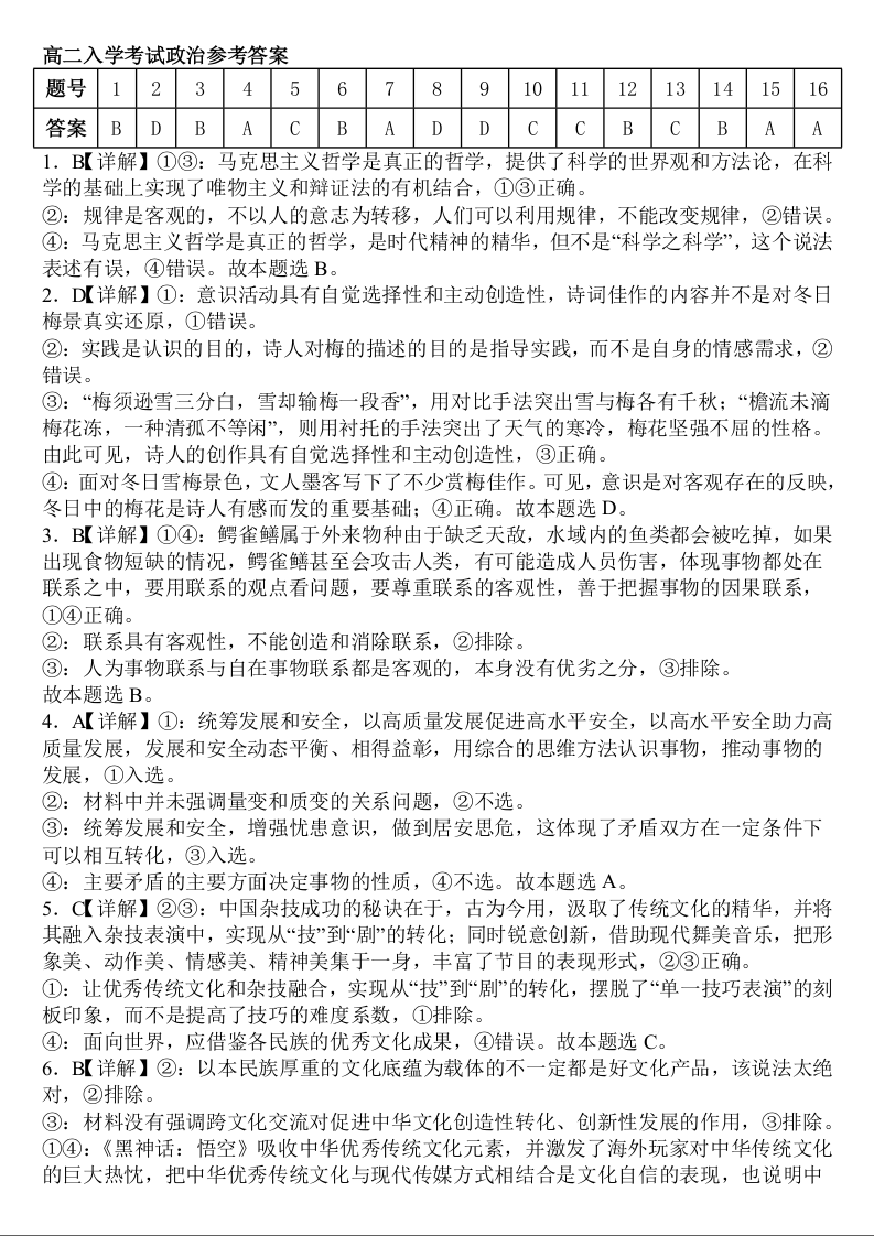 高二政治答案--四川省南充市嘉陵一中2025-2026学年高二下学期入学考试