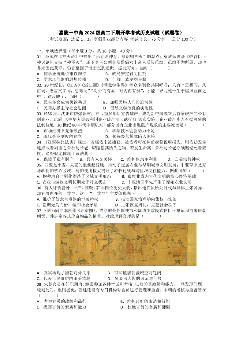 高二历史--四川省南充市嘉陵一中2025-2026学年高二下学期入学考试