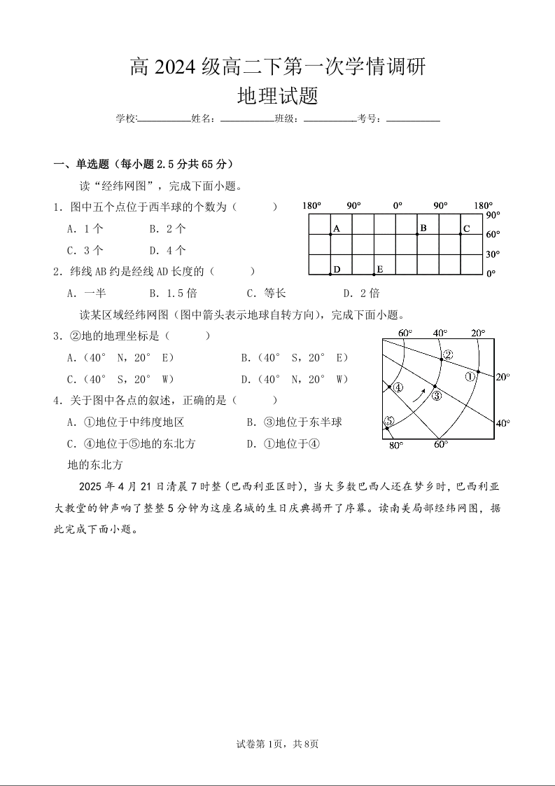 高二地理+答案--四川省南充市嘉陵一中2025-2026学年高二下学期入学考试