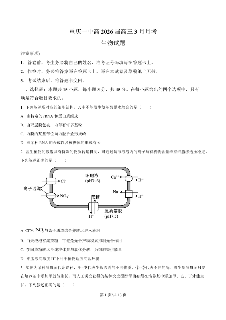 高三生物(原卷版)--重庆市第一中学2026届高三下学期3月月考