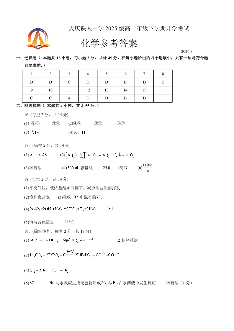 高一化学答案--黑龙江省大庆铁人中学2025-2026学年高一下学期开学考试