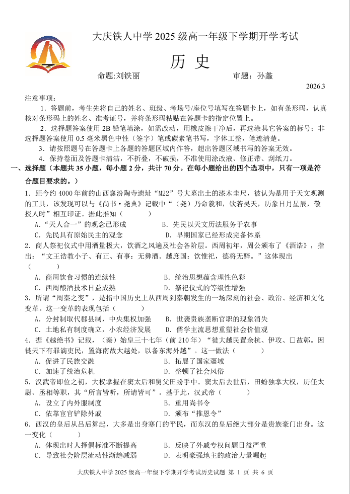 高一历史--黑龙江省大庆铁人中学2025-2026学年高一下学期开学考试