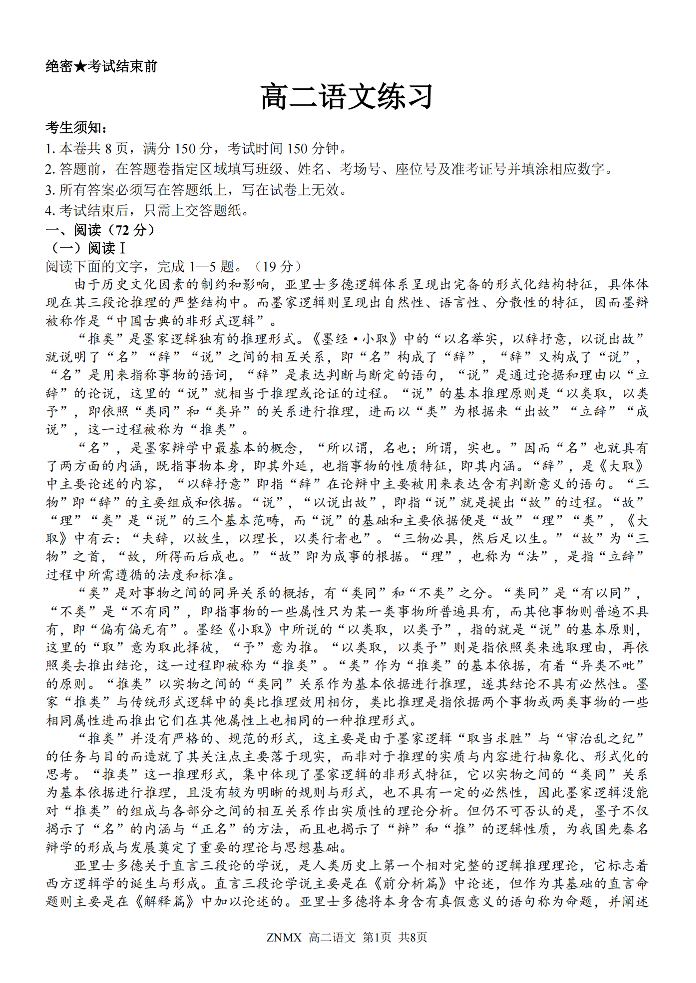 高二语文--浙江省浙南名校联盟2025-2026学年高二年级下学期返校(开学)考试