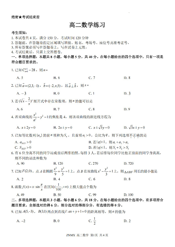 高二数学--浙江省浙南名校联盟2025-2026学年高二年级下学期返校(开学)考试