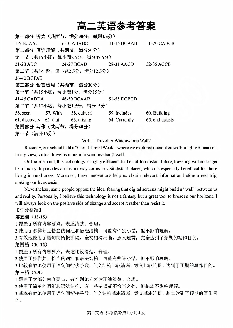 高二英语答案--浙江省浙南名校联盟2025-2026学年高二年级下学期返校(开学)考试