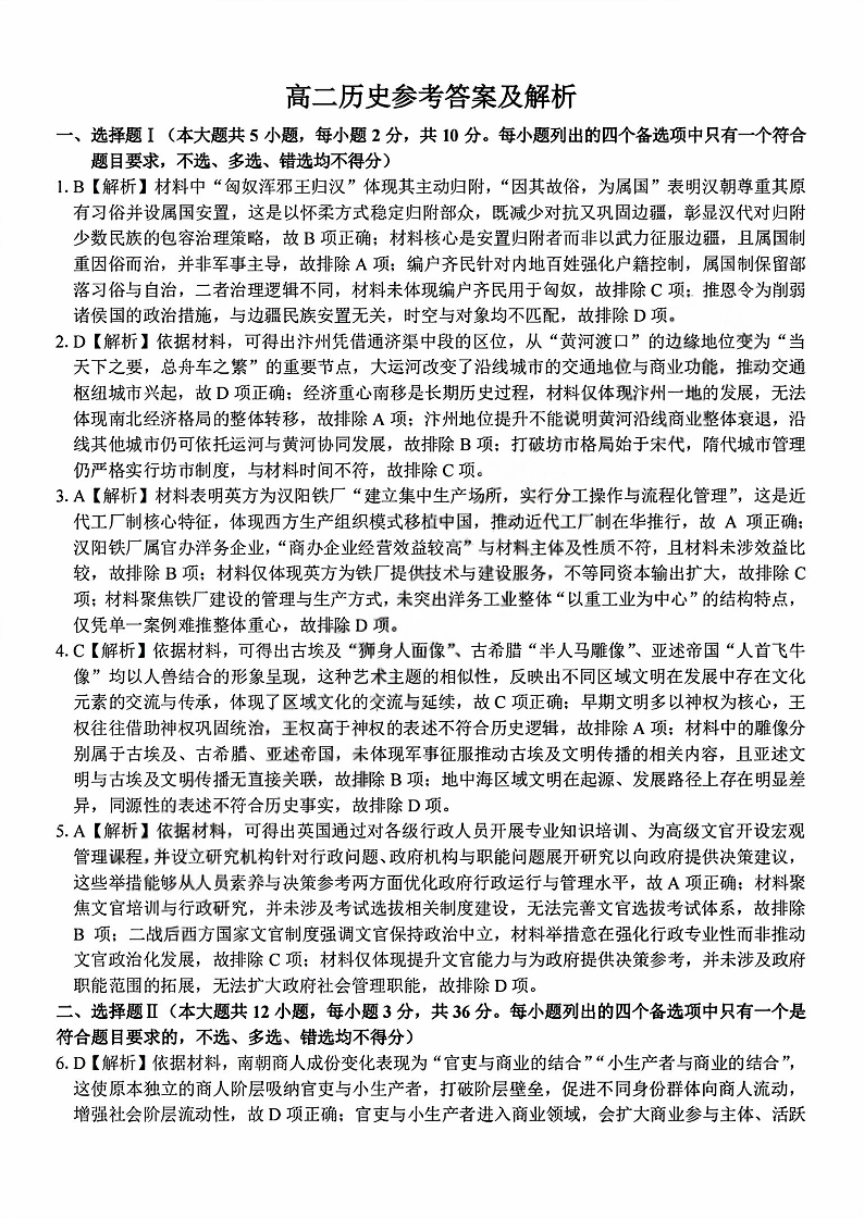 高二历史答案--浙江省浙南名校联盟2025-2026学年高二年级下学期返校(开学)考试