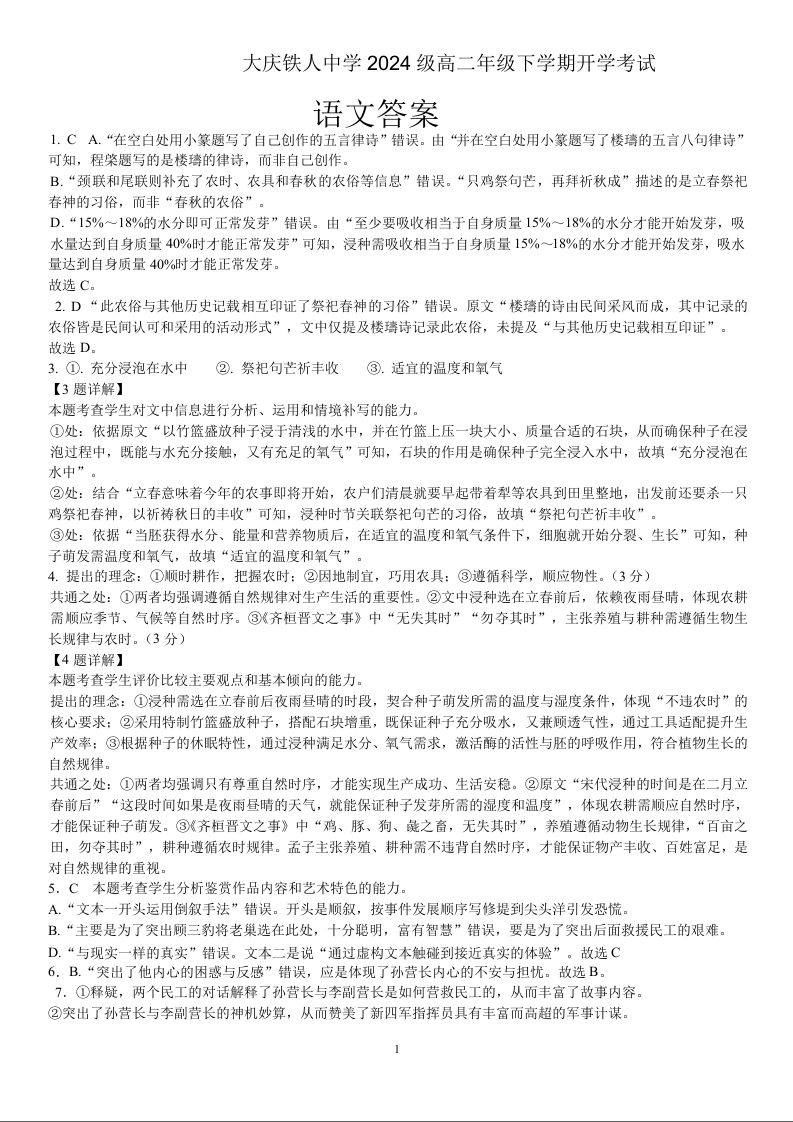 高二语文答案--黑龙江省大庆铁人中学2025-2026学年高二下学期开学考试