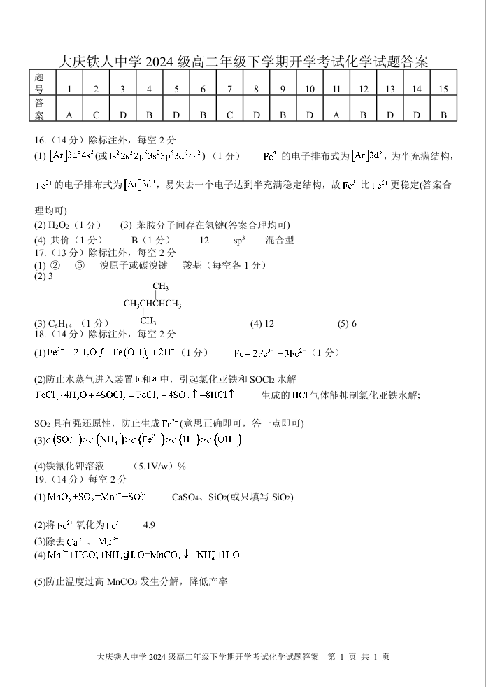 高二化学答案--黑龙江省大庆铁人中学2025-2026学年高二下学期开学考试