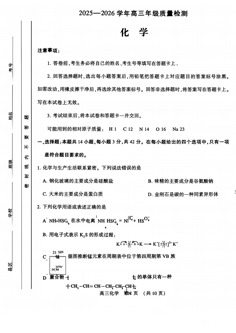 高三化学--河南许平洛济2026届高三第三次质量检测