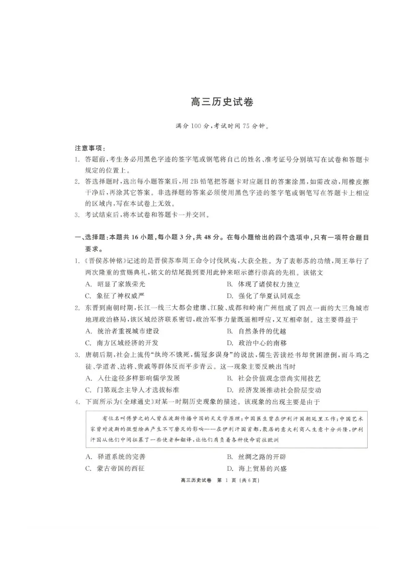高三历史--青海省大通县朔山中学2026届高三下学期3月开学考试
