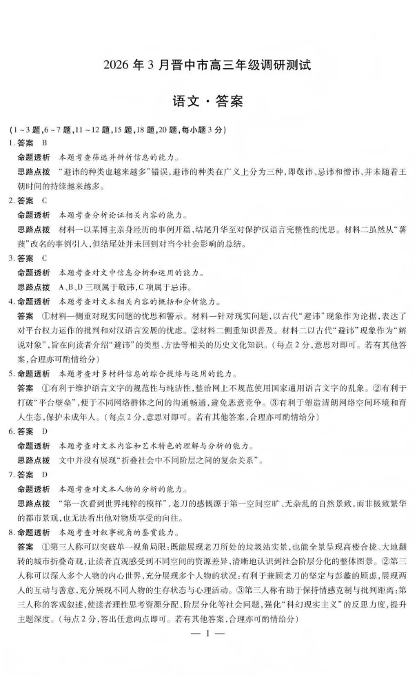 高三语文答案--山西省晋中市2026届高三年级3月调研测试