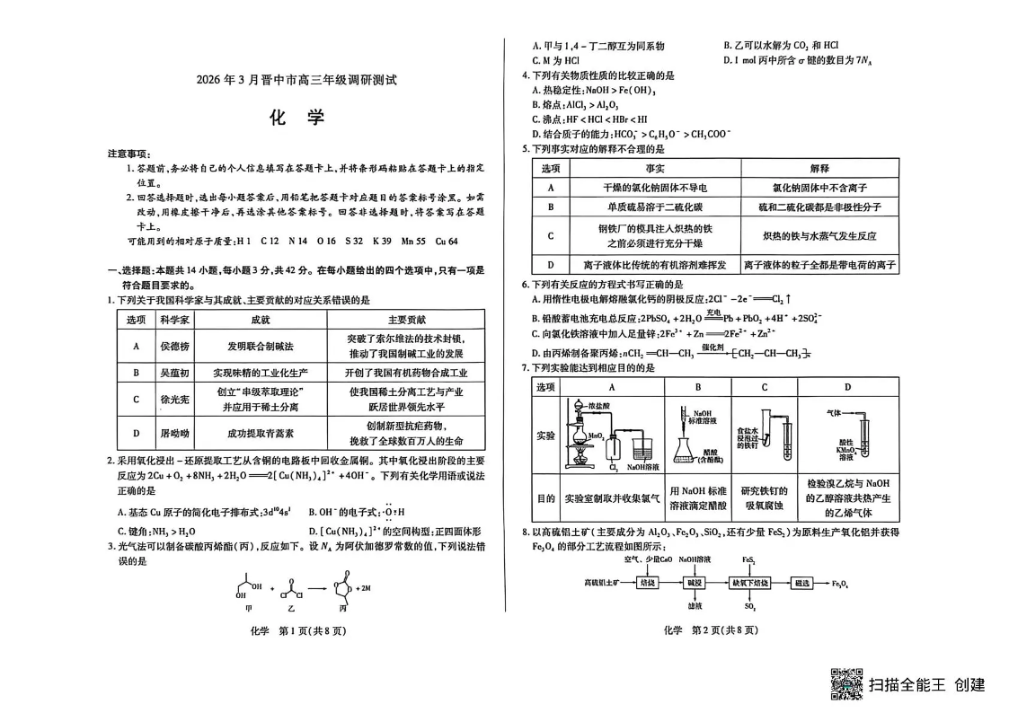 高三化学--山西省晋中市2026届高三年级3月调研测试