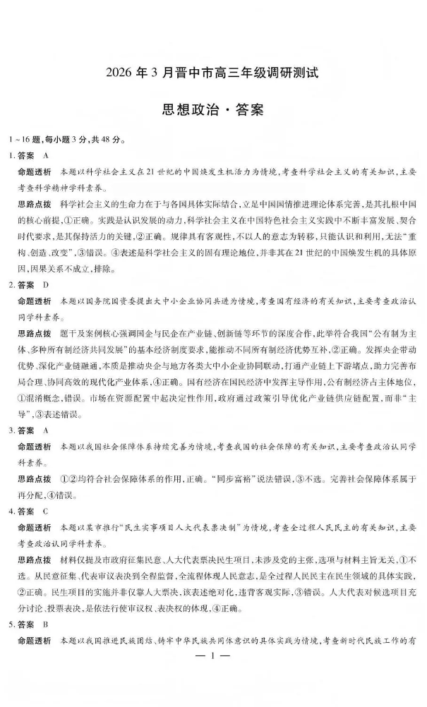 高三政治答案--山西省晋中市2026届高三年级3月调研测试