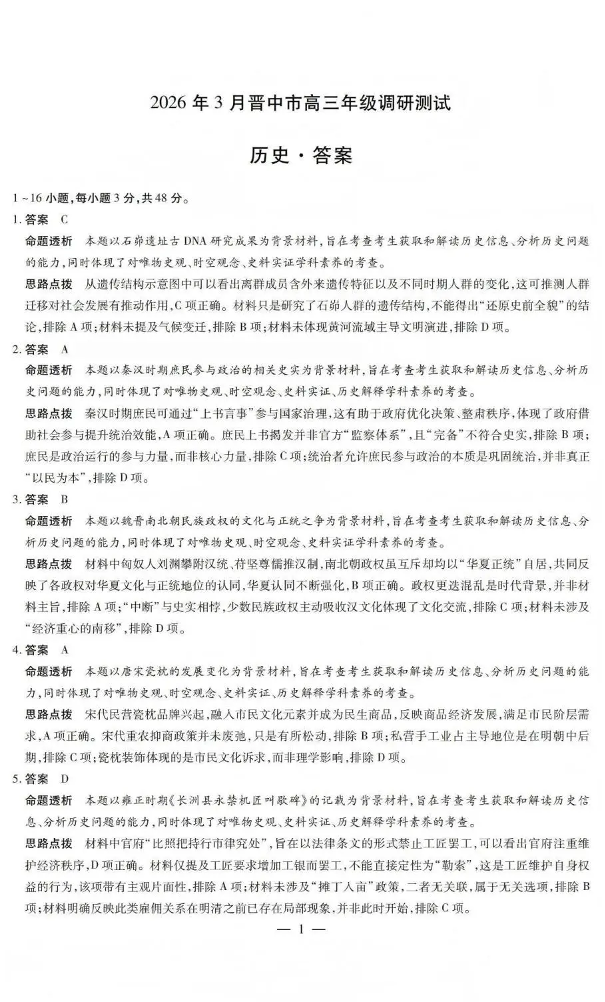 高三历史答案--山西省晋中市2026届高三年级3月调研测试