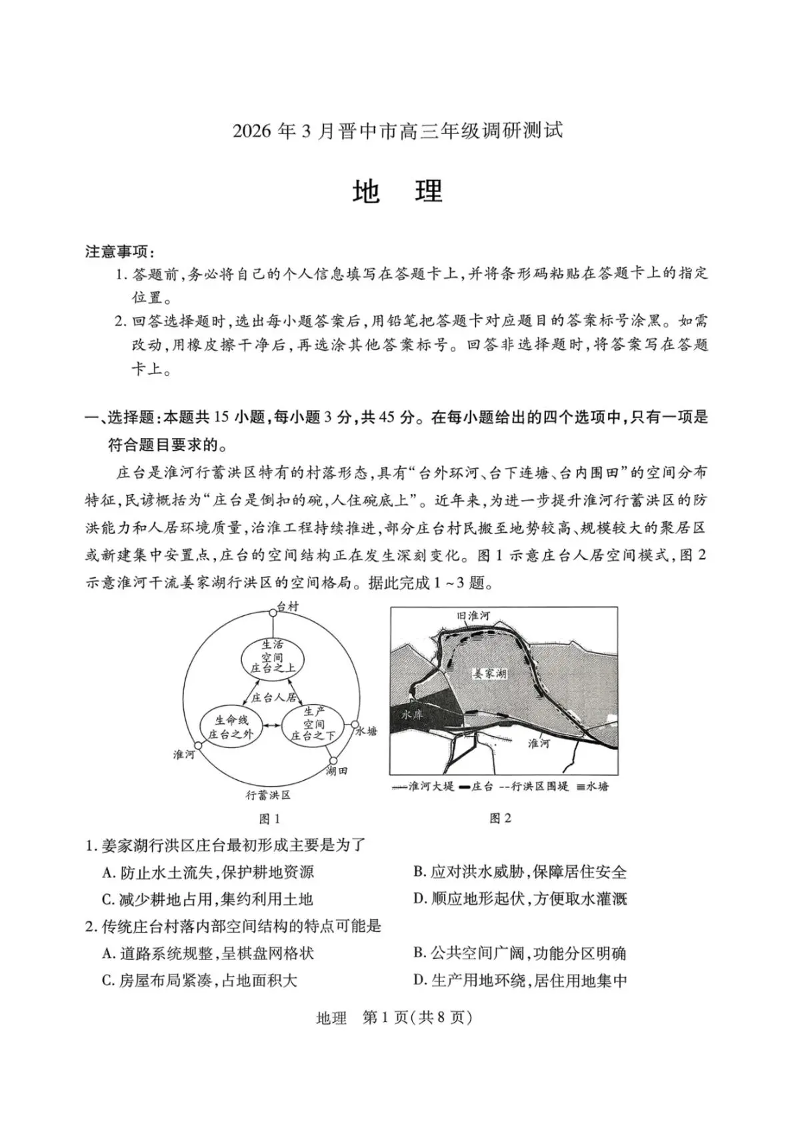 高三地理--山西省晋中市2026届高三年级3月调研测试