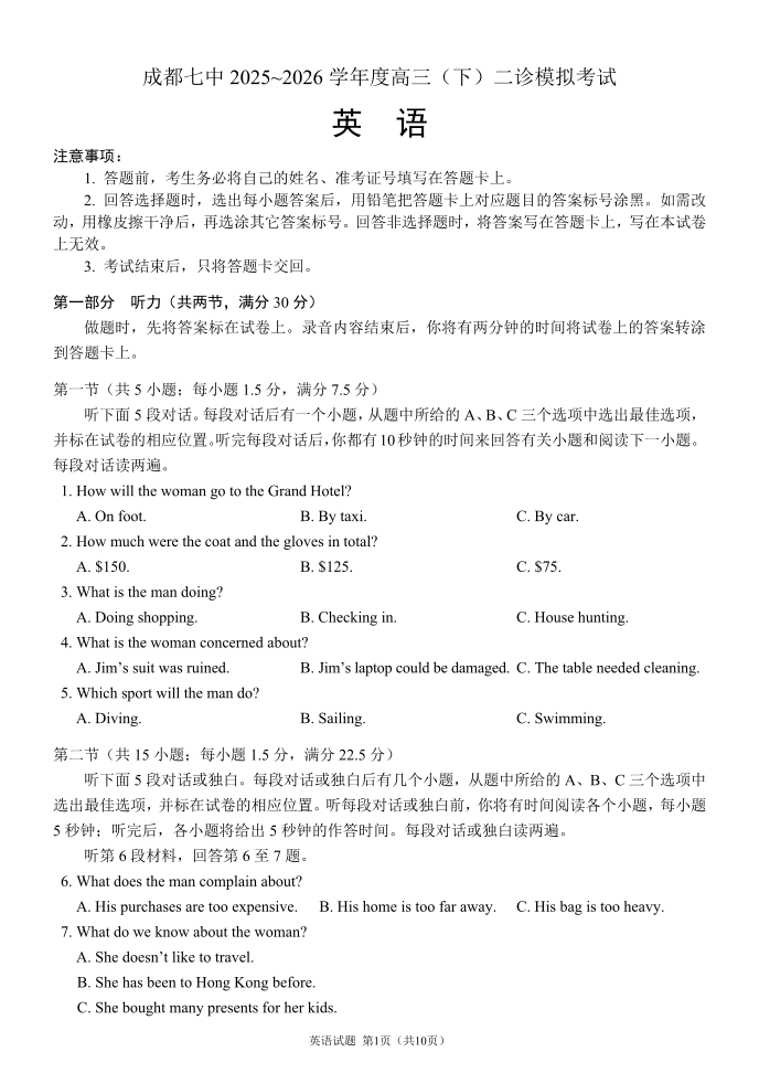 高三英语--四川省成都市第七中学2026届高三二诊模拟考试