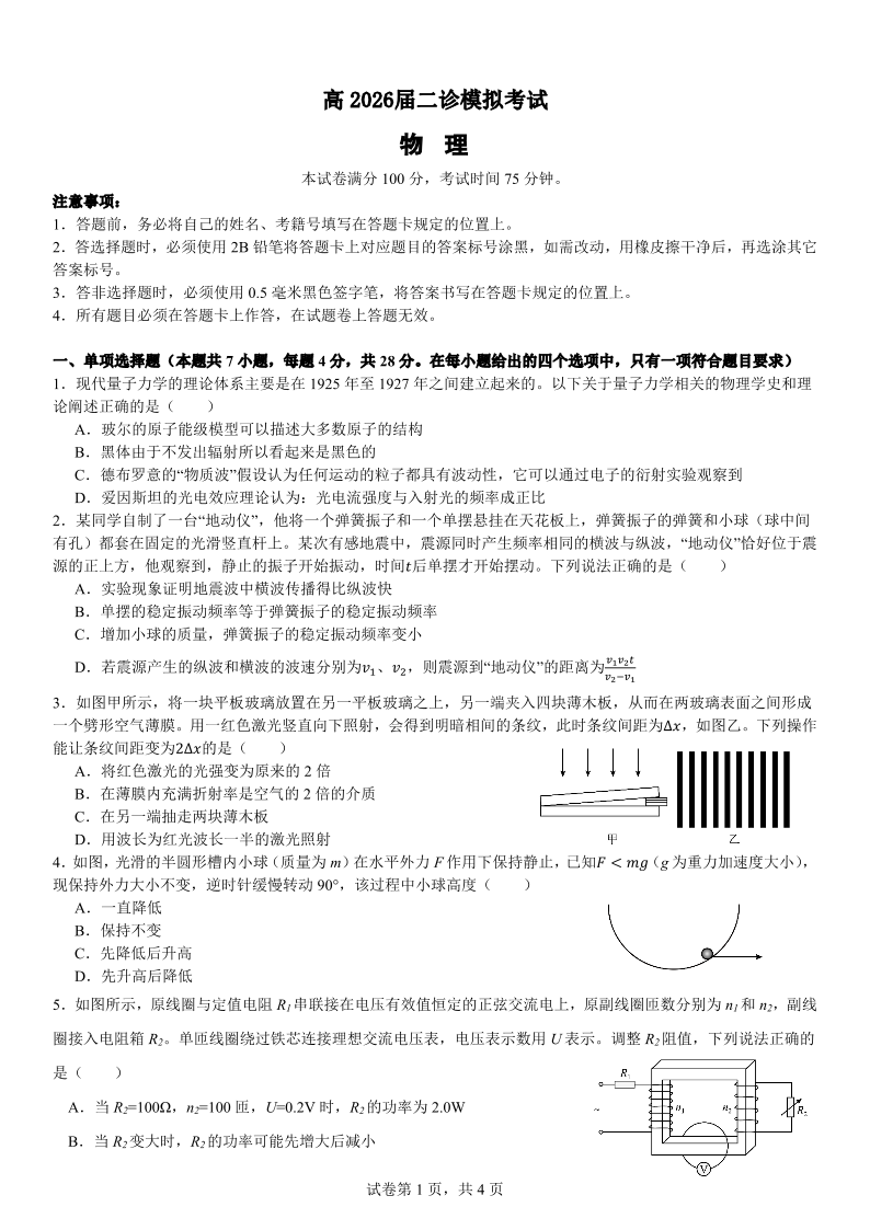 高三物理--四川省成都市第七中学2026届高三二诊模拟考试